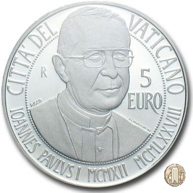 5 Euro 2012 Centenario della nascita di Giovanni Paolo I Dritto: Al centro lo stemma di Papa Benedetto XVI circondato da un cerchio di perline; nel giro la legenda "BENEDICTVS PP. XVI A.D. MMXII • S.P. VIII". Verso: Al centro busto di tre quarti a sinistra di Papa Giovanni Paolo I circondato da un cerchio di perline; sulla sinistra il segno di Zecca "R" e il nome dello scultore "FUSCO"; sulla destra il valore disposto su due righe "5" e "EURO" e il nome dell'incisore "E. L. FRAPICCINI INC."; nel giro, in alto, la legenda "CITTA' DEL VATICANO"; in basso la legenda "IOANNES PAVLVS I MCMXII MCMLXXVIII". | |
