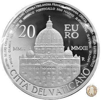 20 Euro 2012 Decennale Euro Vaticano Dritto: Al centro profilo sinistro di Papa Benedetto XVI; sulla destra il nome dello scultore "P. DANIELE"; nel giro la legenda "BENEDICTVS XVI P.M. ANNO VIII - MMXII". Verso: Al centro prospetto frontale della Basilica di San Pietro in Vaticano con in basso, in semicerchio, dieci stelle; sulla sinistra il numero "20" e l'anno "MMII"; sulla destra, disposta su due righe la parola "EU" "RO", l'anno "MMXII" e il segno della Zecca "R"; nel giro, in alto su due righe i Paesi che hanno monete Euro proprie "AUSTRIA BELGIO CIPRO CITTA' DEL VATICANO ESTONIA FINLANDIA FRANCIA GERMANIA GRECIA IRLANDA ITALIA LUSSEMBURGO" ". MALTA OLANDA PRINCIPATO DI MONACO PORTOGALLO SAN MARINO SLOVACCHIA SLOVENIA SPAGNA •"; in basso la legenda "CITTA' DEL VATICANO". | |
