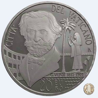 20 Euro 2013 Bicentenario della nascita di Giuseppe Verdi Dritto: Al centro lo stemma di Papa Benedetto XVI; sulla destra il nome dello scultore "D. LONGO"; in basso il nome dell'incisore "L. DE SIMONI INC."; nel giro la legenda "BENEDICTVS PP. XVI A.D. MMXIII". Verso: Sulla sinasta il busto del compositore italiano Giuseppe Verdi con alle spalle vista, dall'interno, del Teatro di Busseto (PR), sulla destra raffigurazione di figura femminile ed elementi egizi rappresentativi dell'Aida, il segno della Zecca "R", la legenda "G. VERDI 1813 • 1901"; in basso il valore "20" con la parola, disposta su due righe, "EU" "RO"; nel giro la legenda "CITTA' DEL VATICANO". | |