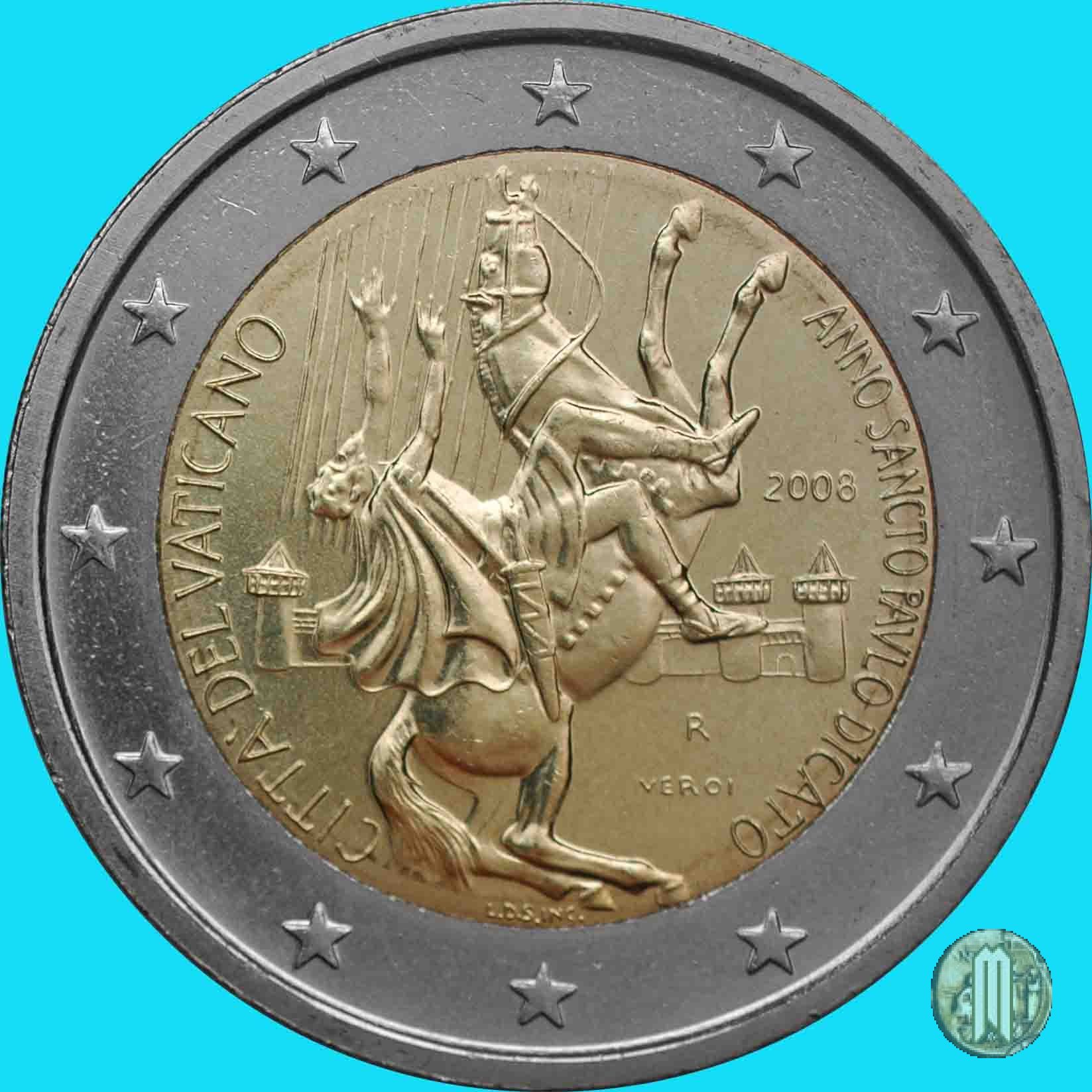 2 Euro 2008 Anno Paolino Dritto: Al centro della moneta la raffigurazione di San Paolo che cade da cavallo sulla strada per Damasco; in alto i raggi divini. A destra il millesimo di conio "2008", il segno di Zecca "R" e la firma dell'autore "VEROI"; sotto la firma dell'incisore "L.D.S.INC.". Intorno "CITTA' DEL VATICANO" e sulla destra, "ANNO SANCTO PAVLO DICATO". Nella corona esterna le 12 stelle simbolo dell'UE. Verso: Faccia comune (NUOVO DISEGNO) | |