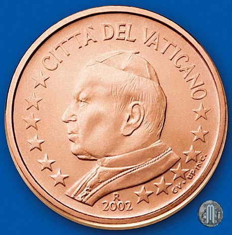1 centesimo di Euro Dritto: Al centro il ritratto di Giovanni Paolo II rivolto a sinistra. Sotto di esso il segno di Zecca "R" e il millesimo. A destra, ad arco, la scritta "GV • UP INC." ad indicare lo scultore e l'incisore della moneta. Intorno le 12 stelle simbolo dell'UE divise a mezzo dalla scritta "CITTA' DEL VATICANO". Verso: Faccia comune | |