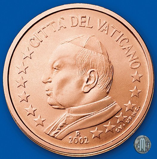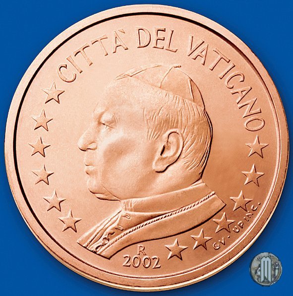2 centesimi di Euro Dritto: Al centro il ritratto di Giovanni Paolo II rivolto a sinistra. Sotto di esso il segno di Zecca "R" e il millesimo. A destra, ad arco, la scritta "GV • UP INC." ad indicare lo scultore e l'incisore della moneta. Intorno le 12 stelle simbolo dell'UE divise a mezzo dalla scritta "CITTA' DEL VATICANO". Verso: Faccia comune | |