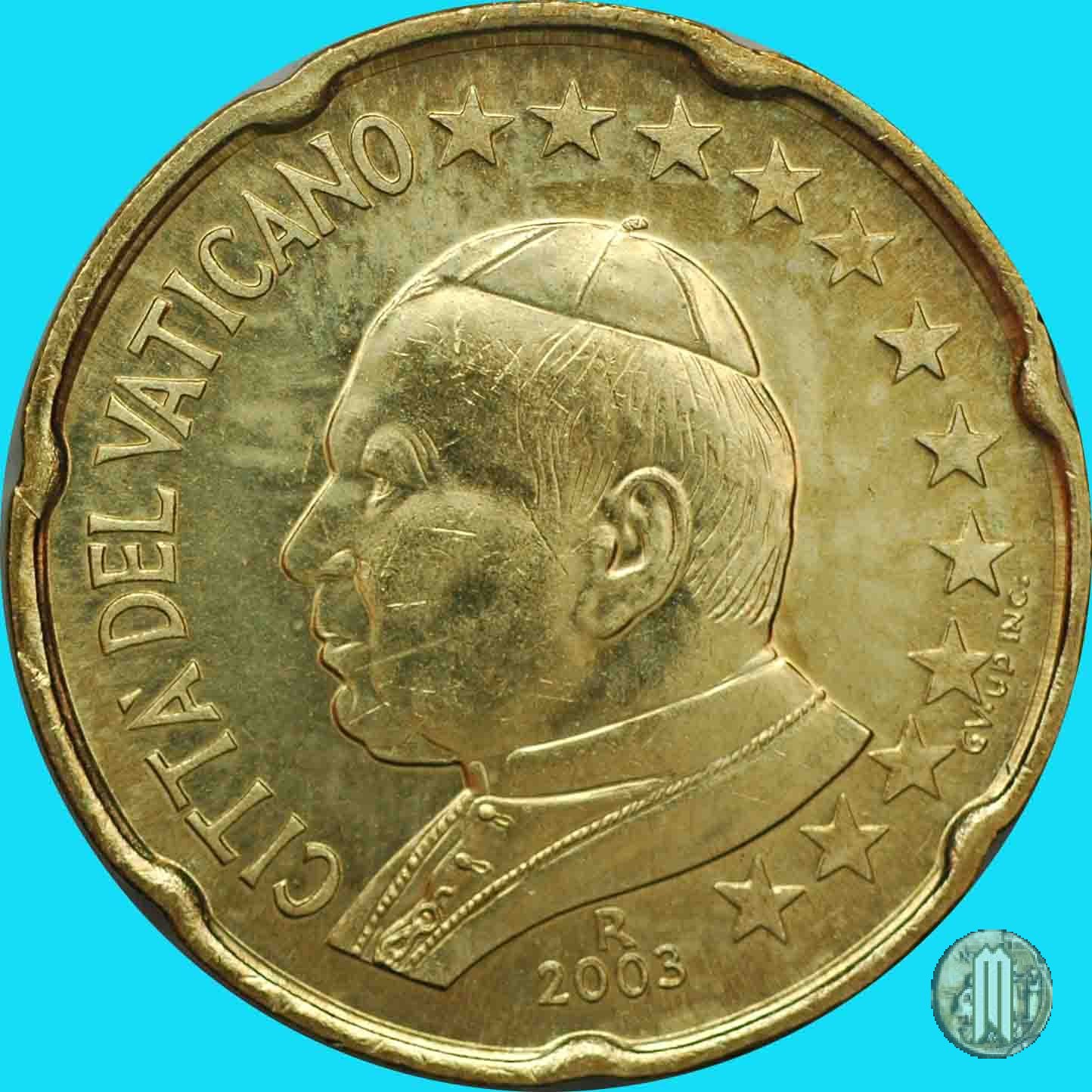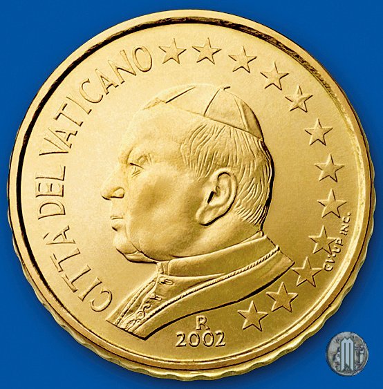20 centesimi di Euro Dritto: Al centro il ritratto di Giovanni Paolo II rivolto a sinistra. Sotto di esso il segno di Zecca "R" e il millesimo. A destra, ad arco, la scritta "GV • UP INC." ad indicare lo scultore e l'incisore della moneta. Intorno le 12 stelle simbolo dell'UE precedute dalla scritta "CITTA' DEL VATICANO". Verso: Faccia comune | |