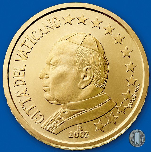 50 centesimi di Euro Dritto: Al centro il ritratto di Giovanni Paolo II rivolto a sinistra. Sotto di esso il segno di Zecca "R" e il millesimo. A destra, ad arco, la scritta "GV • UP INC." ad indicare lo scultore e l'incisore della moneta. Intorno le 12 stelle simbolo dell'UE precedute dalla scritta "CITTA' DEL VATICANO". Verso: Faccia comune | |