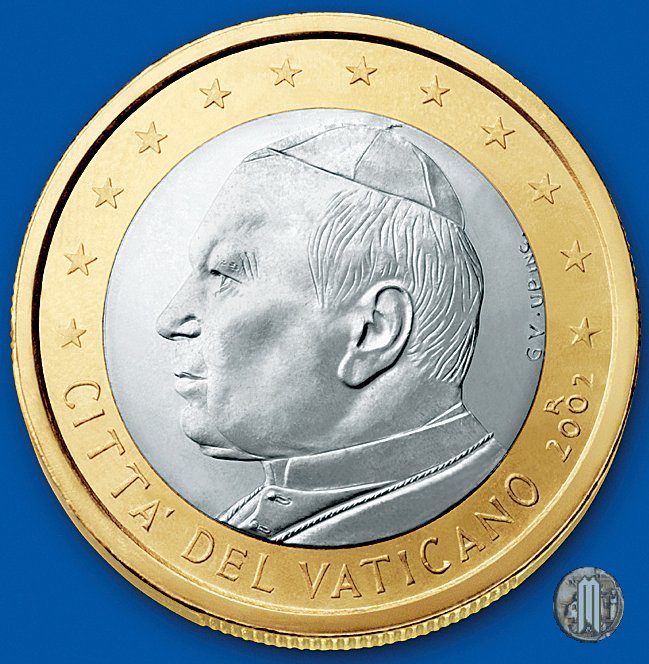 1 Euro Dritto: Al centro il ritratto di Giovanni Paolo II rivolto a sinistra. A destra, ad arco, la scritta "GV • UP INC." ad indicare lo scultore e l'incisore della moneta. Intorno, nella metà superiore, le 12 stelle simbolo dell'UE e "CITTA' DEL VATICANO", il simbolo di Zecca "R" e il millesimo di conio nella metà inferiore. Verso: Faccia comune | |