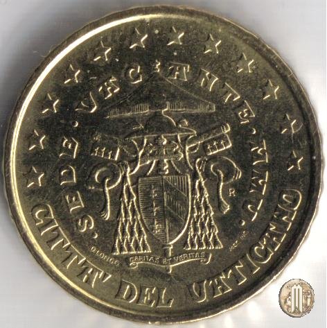 20 centesimi di Euro Dritto: Al centro il ritratto di Benedetto XVI rivolto a destra. Sopra le spalle le sigle dell'autore e dell'incisore "D.L." e "L.D.S.INC." e il segno di Zecca "R". Sotto il ritratto, ad arco, "CITTA' DEL VATICANO •" seguito dal millesimo. Intorno le 12 stelle simbolo dell'UE. Verso: Faccia comune - dal 2008 nuova faccia comune. | |