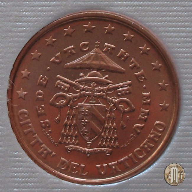 1 centesimo di Euro Dritto: Al centro lo stemma del Cardinale Camerlengo e quello della Camera Apostolica (chiavi decussate sormontate da un padiglione. Intorno a questo," • SEDE • VACANTE • MMV •" e accanto il segno di Zecca "R". Sotto le firme dell'autore e dell'incisore, "D.LONGO" e "M.A.C.INC.". Intorno nella metà superiore le 12 stelle simbolo dell'UE, sotto "CITTA' DEL VATICANO". Verso: Faccia comune | |