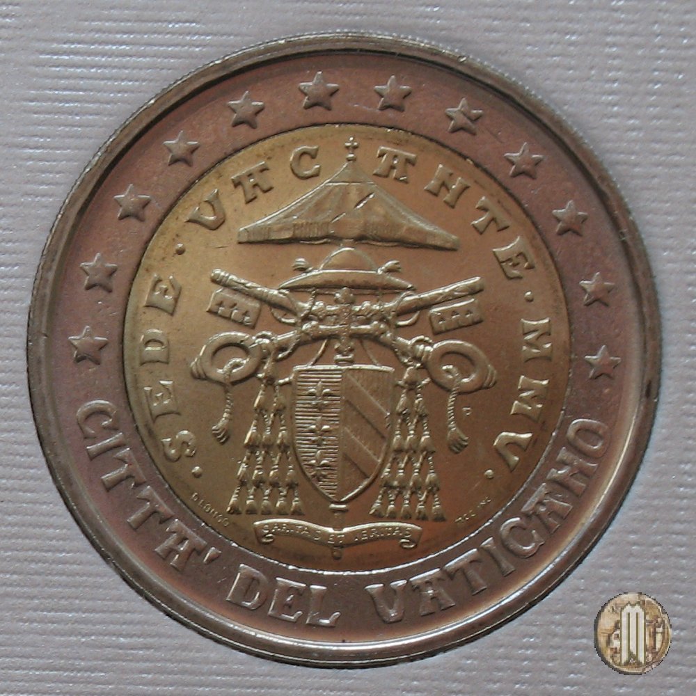 2 Euro Dritto: Al centro lo stemma del Cardinale Camerlengo e quello della Camera Apostolica (chiavi decussate sormontate da un padiglione. Intorno a questo," • SEDE • VACANTE • MMV •" e accanto il segno di Zecca "R". Sotto le firme dell'autore e dell'incisore, "D.LONGO" e "M.A.C.INC.". Intorno nella metà superiore le 12 stelle simbolo dell'UE, sotto "CITTA' DEL VATICANO". Verso: Faccia comune | |