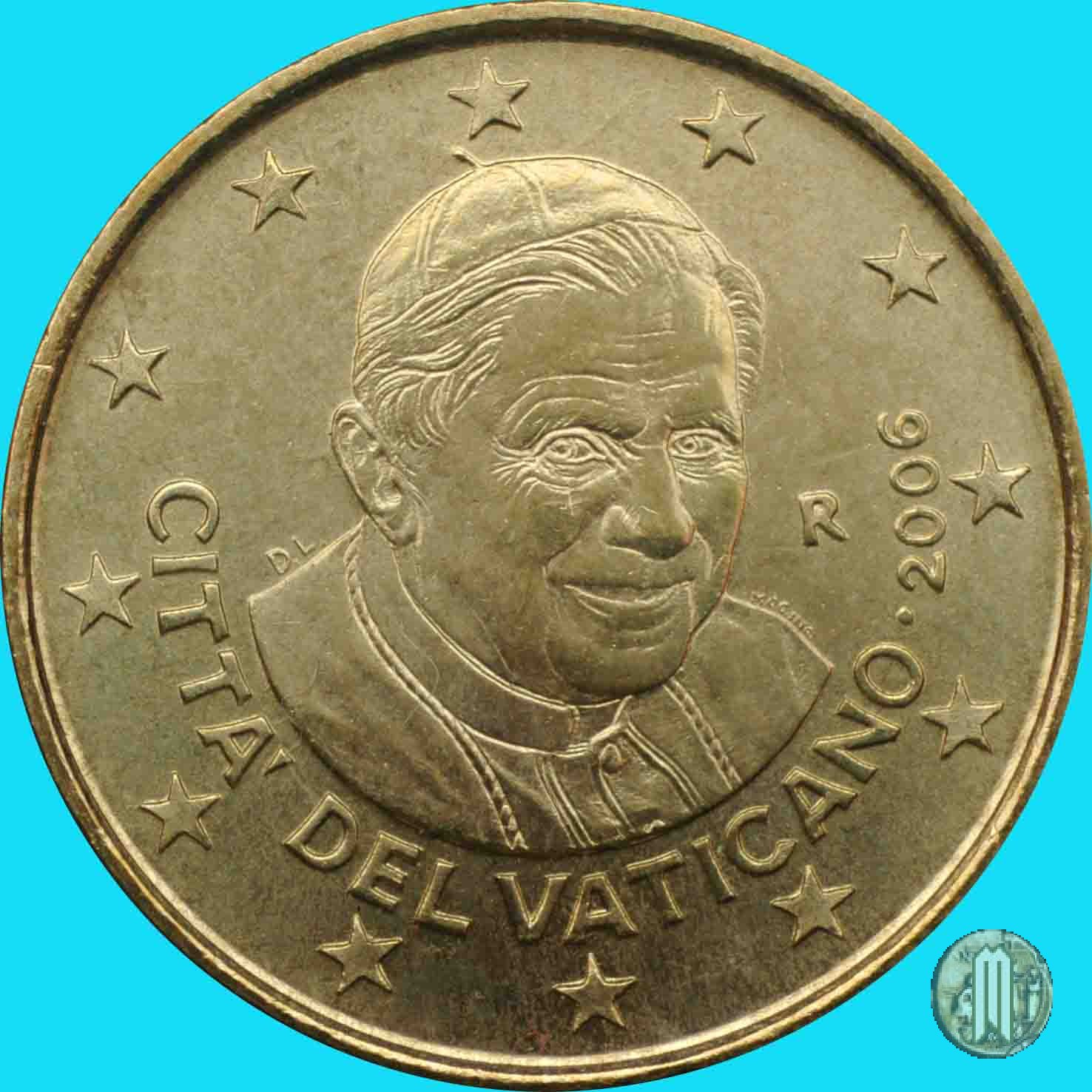 50 centesimi di Euro Dritto: Al centro il ritratto di Benedetto XVI rivolto a destra. Sopra le spalle le sigle dell'autore e dell'incisore "D.L." e "L.D.S.INC." e il segno di Zecca "R". Sotto il ritratto, ad arco, "CITTA' DEL VATICANO •" seguito dal millesimo. Intorno le 12 stelle simbolo dell'UE. Verso: Faccia comune - dal 2008 nuova faccia comune. | |