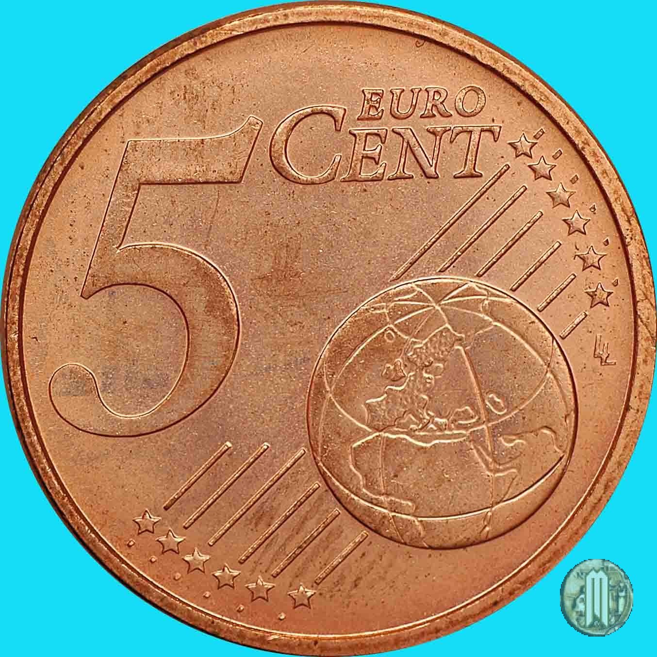 5 centesimi di Euro Dritto: Al centro il ritratto di Giovanni Paolo II rivolto a sinistra. Sotto di esso il segno di Zecca "R" e il millesimo. A destra, ad arco, la scritta "GV • UP INC." ad indicare lo scultore e l'incisore della moneta. Intorno le 12 stelle simbolo dell'UE divise a mezzo dalla scritta "CITTA' DEL VATICANO". Verso: Faccia comune | |