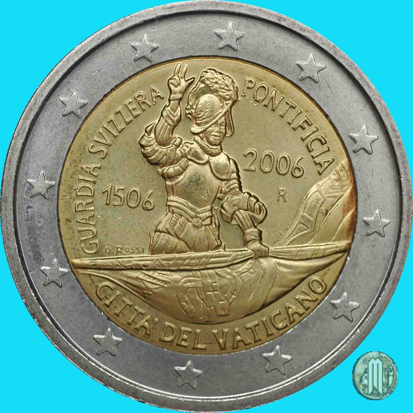 2 Euro 2006 Cinquecentenario dell'Istituzione della Guardia Svizzera Dritto: Al centro una Guardia Svizzera nell'atto del giuramento con in mano uno stendardo. Alla sua sinistra l'anno di creazione del corpo "1506" e il nome dell'autore "O.ROSSI"; alla sua destra l'anno di emissione "2006" con sotto il segno di Zecca "R" e la firma dello scultore "M.C.C.INC.". Intorno la scritta "GUARDIA SVIZZERA PONTIFICIA" e sotto "CITTA' DEL VATICANO". Nel contorno le 12 stelle simboleggianti l'UE. Verso: Faccia comune | |