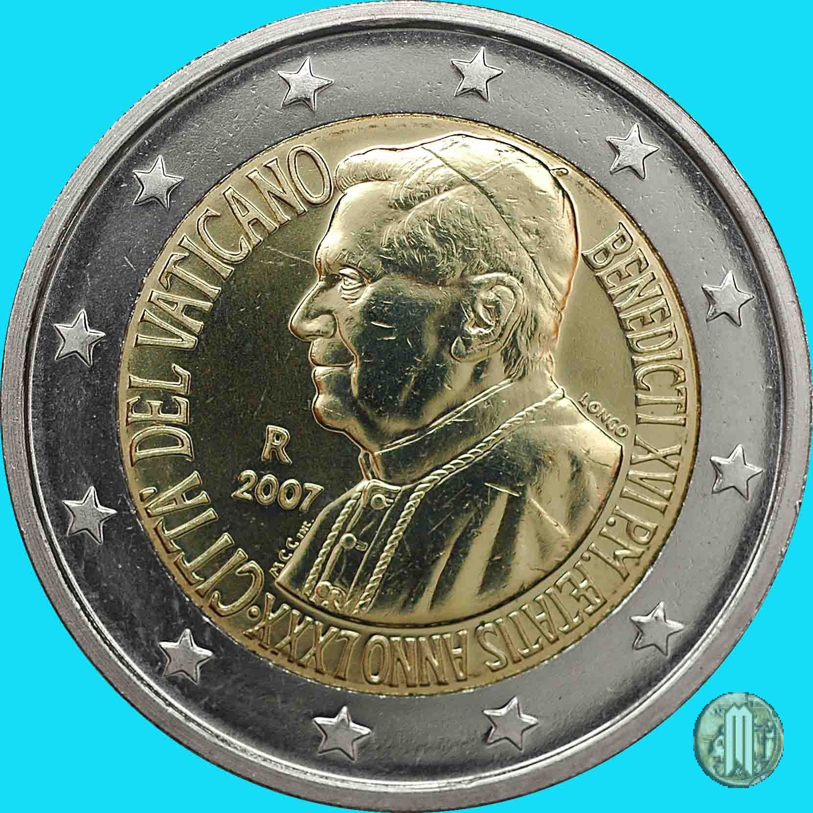 2 Euro 2007 80° Genetliaco di Benedetto XVI Dritto: Al centro il busto di Benedetto XVI rivolto a sinistra. Sulle spalle le sigle dell'autore e dell'incisore, "M.C.C.INC." e "LONGO"; a sinistra il segno di Zecca "R" e il millesimo "2007". Intorno "BENEDICTI XVI P.M. ÆTATIS ANNO LXXX • CITTA' DEL VATICANO". Intorno le 12 stelle dell'UE. Verso: Faccia comune | |