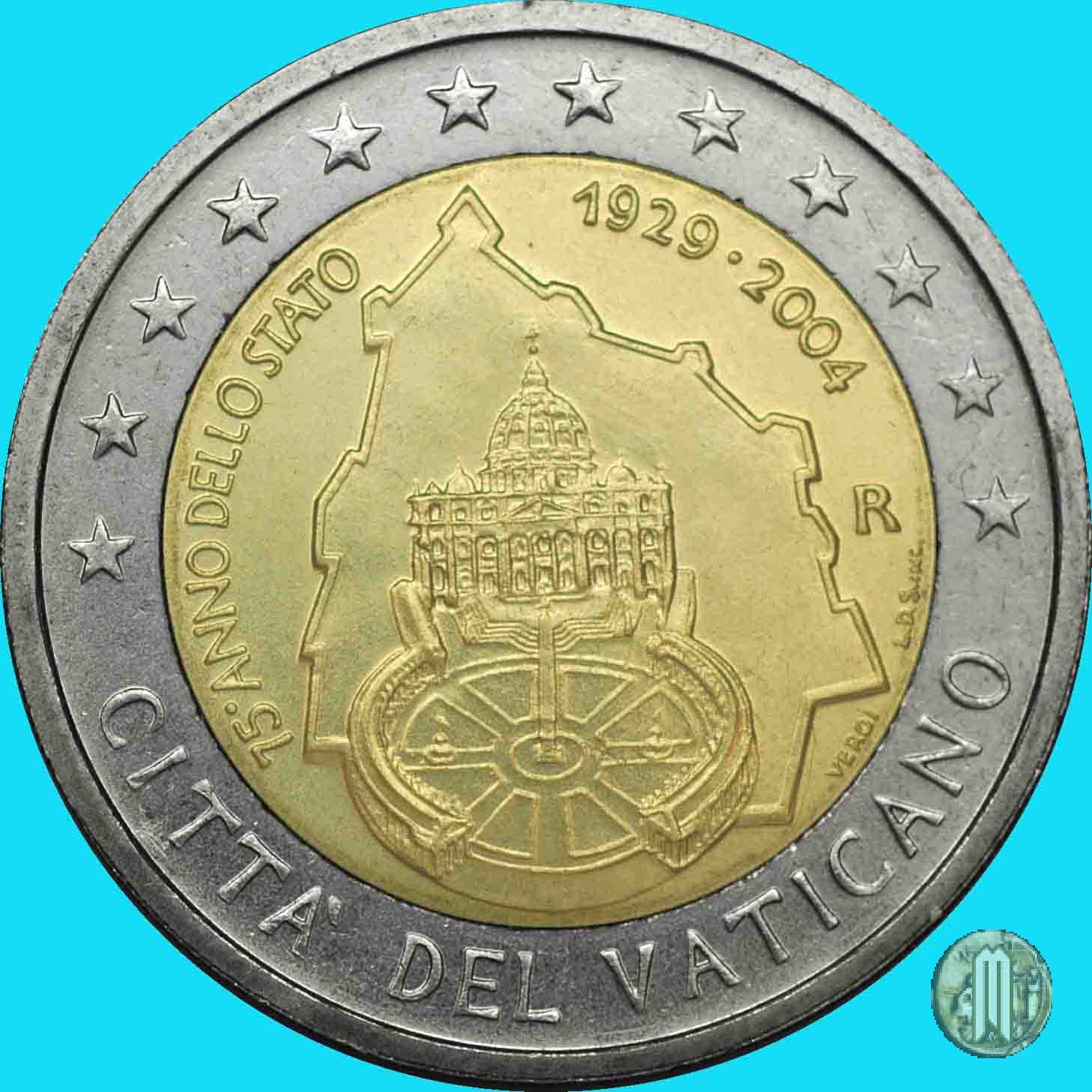 2 Euro 2004 75° Anniversario della Fondazione della Città del Vaticano Dritto: Al centro della moneta il perimetro dello Stato del Vaticano, con all'interno un dettaglio di Piazza San Pietro. Intorno partendo da sinistra, "75°ANNO DELLO STATO", seguito da "1929 • 2004" e dal segno di Zecca "R". Sulla destra le firme dello scultore e dell'incisore, "VEROI" e "L.D.S.INC.". Intorno, nella metà superiore, le 12 stelle simbolo dell'UE, sotto "CITTA' DEL VATICANO". Verso: Faccia comune | |