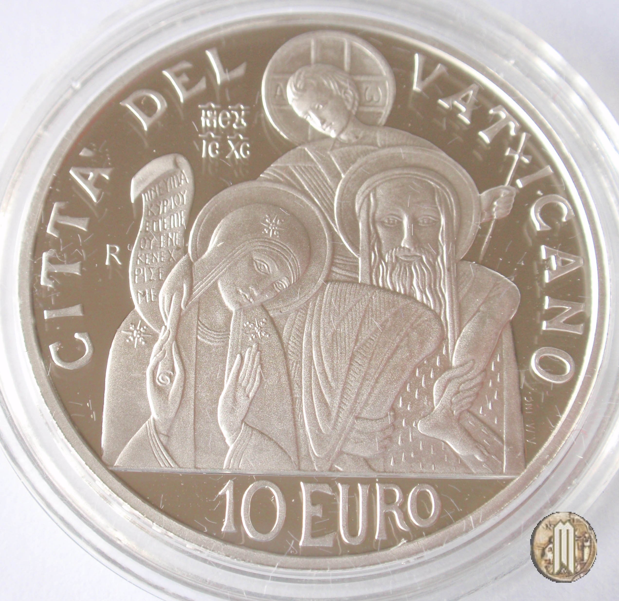 10 Euro 2002 Giornata Mondiale della Pace Dritto: Immagine di Papa Giovanni Paolo II +Iscrizioni: AN.XXIV.MMII-IOANNES PAULUS II P.M. Verso: Cristo Risorto +Iscrizioni: CITTA' del VATICANO - 10 EURO | |