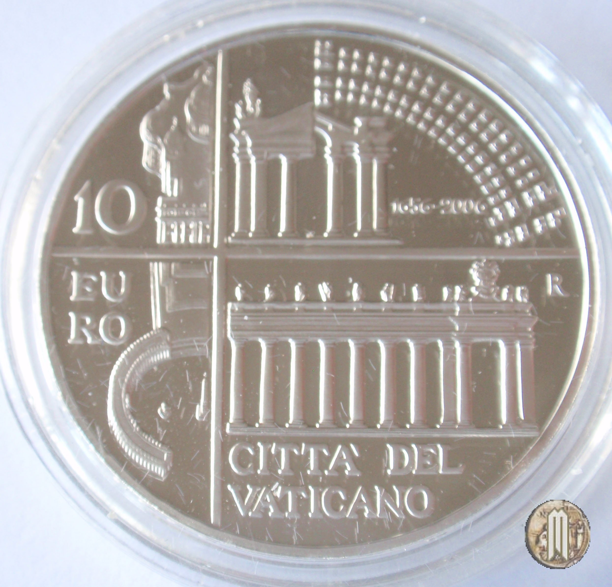 10 Euro 2006 Bernini - Colonnato San Pietro Dritto: Papa Benedetto XVI e Colonnato P.za S.Pietro +Iscrizioni: BENEDICTUS XVI PONT.MAX - ANNO II MMVI Verso: Bernini: Colonnato di P.za S.Pietro 1656-2006 +Iscrizioni: CITTA' DEL VATICANO - 10 EURO | |