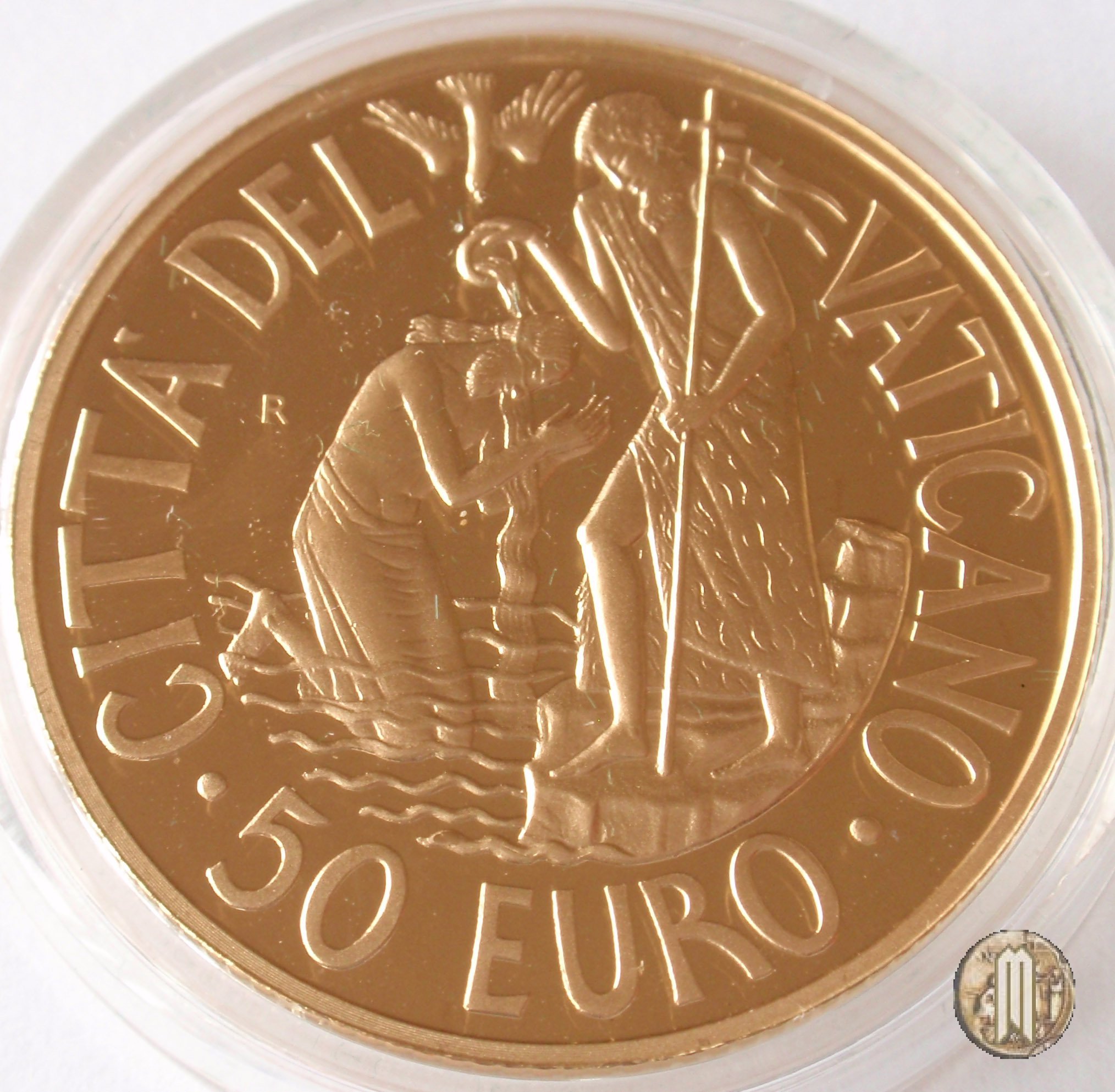 50 Euro 2005 I Sacramenti - Battesimo Dritto: Immagine di Papa Benedetto XVI +Iscrizioni: BENEDICTUS XVI P.M.AN.I-MMV Verso: Giovanni Battista battezza Gesú Cristo nel Giordano +Iscrizioni: CITTA' DEL VATICANO - 50 EURO | |