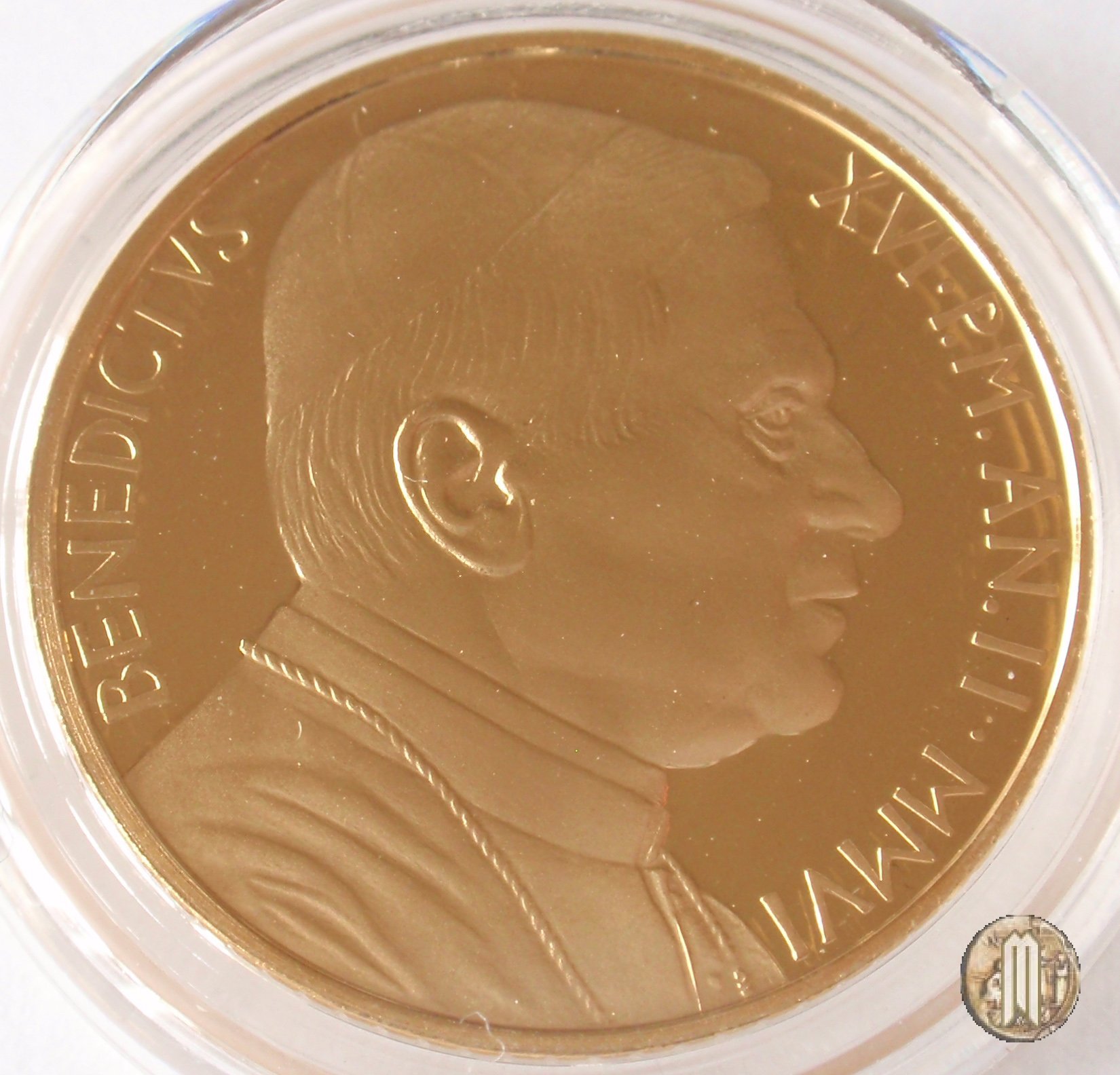 2 Euro Dritto: Al centro il ritratto di Benedetto XVI rivolto a destra. Sopra le spalle le sigle dell'autore e dell'incisore "D.L." e "L.D.S.INC." e il segno di Zecca "R". Sopra il ritratto, ad arco, "CITTA' DEL VATICANO •" seguito dal millesimo. Intorno le 12 stelle simbolo dell'UE. Verso: Faccia comune - dal 2008 nuova faccia comune. | |