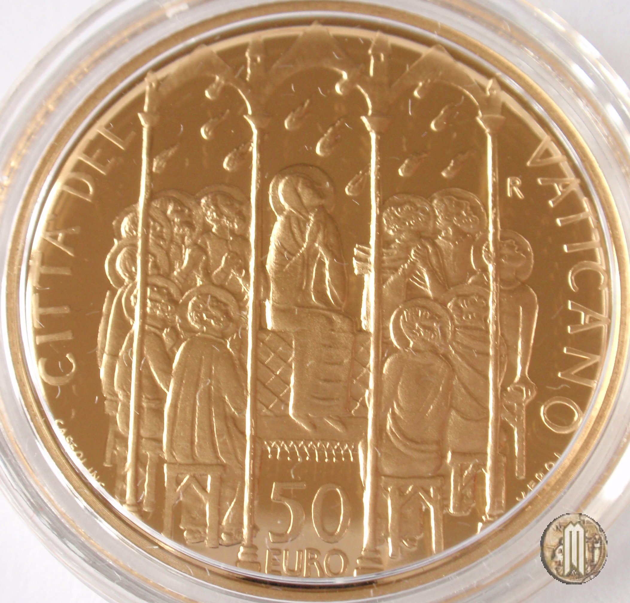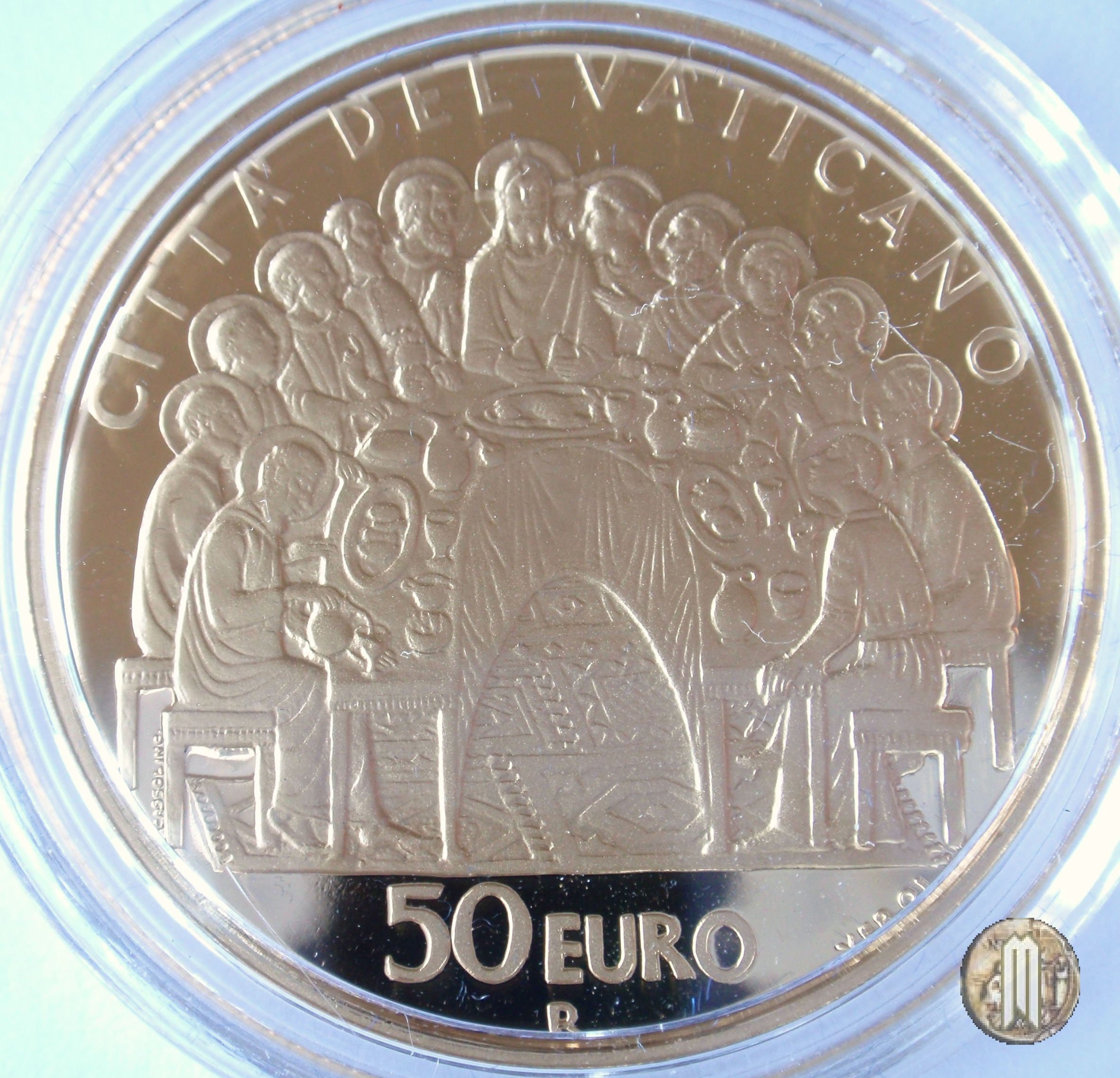 50 Euro 2007 I Sacramenti - Eucarestia Dritto: Immagine di Papa Benedetto XVI +Iscrizioni: BENEDICTI XVI P.M.AETATIS ANNO LXXX-A.III-MMVII Verso: Ultima Cena +Iscrizioni: CITTA' DEL VATICANO - 50 EURO | |