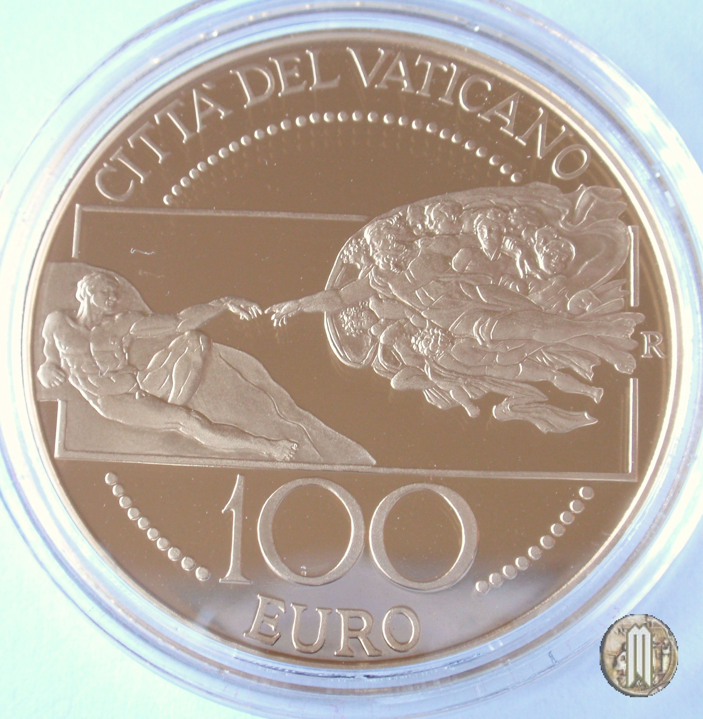 100 Euro 2008 Cappella Sistina - Creazione dell'Uomo Dritto: Immagine di Papa Benedetto XVI +Iscrizioni: BENEDICTUS XVI PONT. MAX.ANNO IV-MMVIII Verso: La Cappella Sistina - La Creazione dell'Uomo +Iscrizioni: CITTA' DEL VATICANO - 100 EURO | |