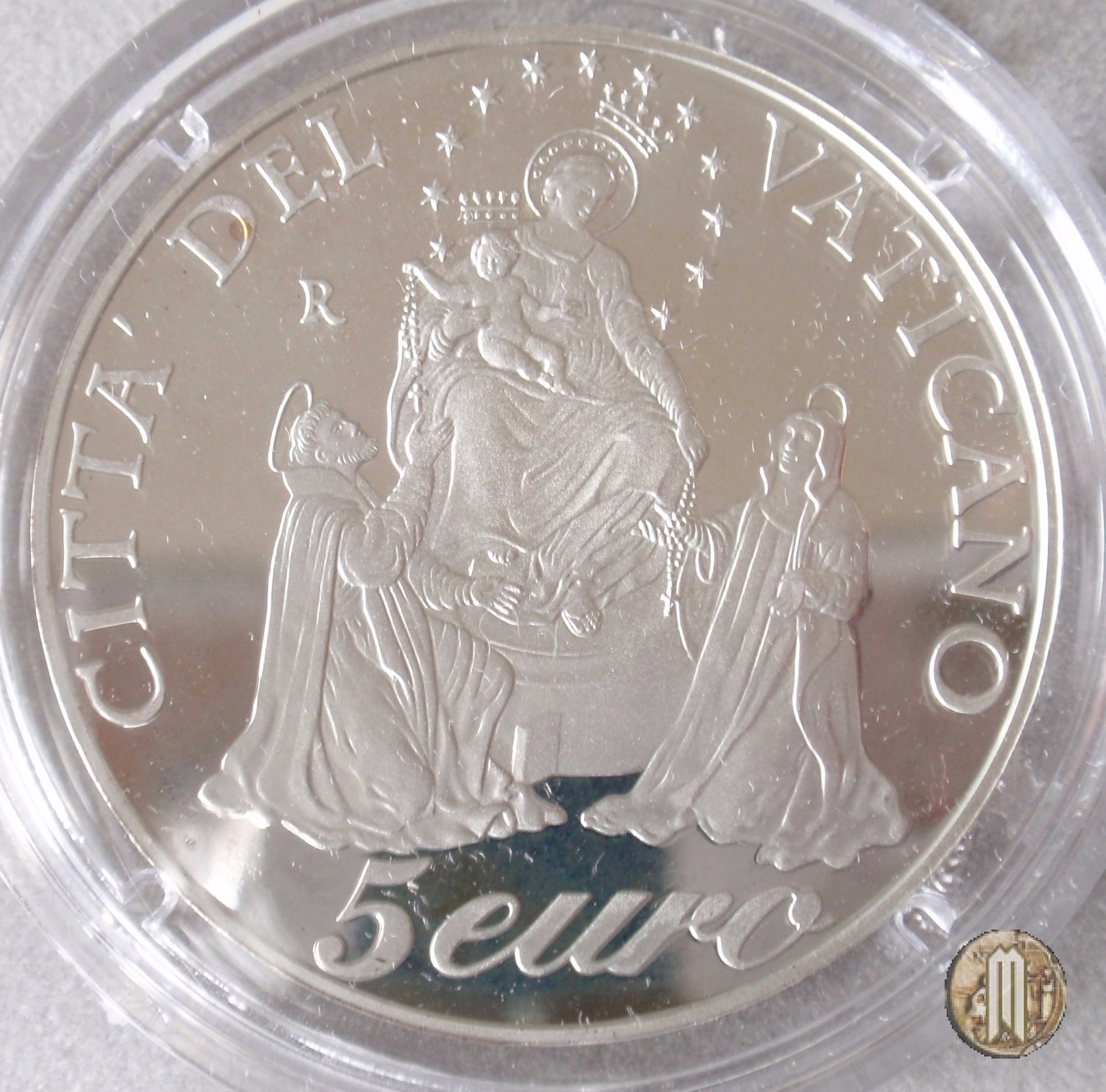 5 Euro 2004 150° ann. proclamazione del Dogma dell'Immacolata Concezione Dritto: Stemmi Vaticani +Iscrizioni: IOANNES PAULUS II P.M. AN.XXVI MMIV Verso: Statua della Madonna +Iscrizioni: CITTA' DEL VATICANO - CINQUE EURO | |
