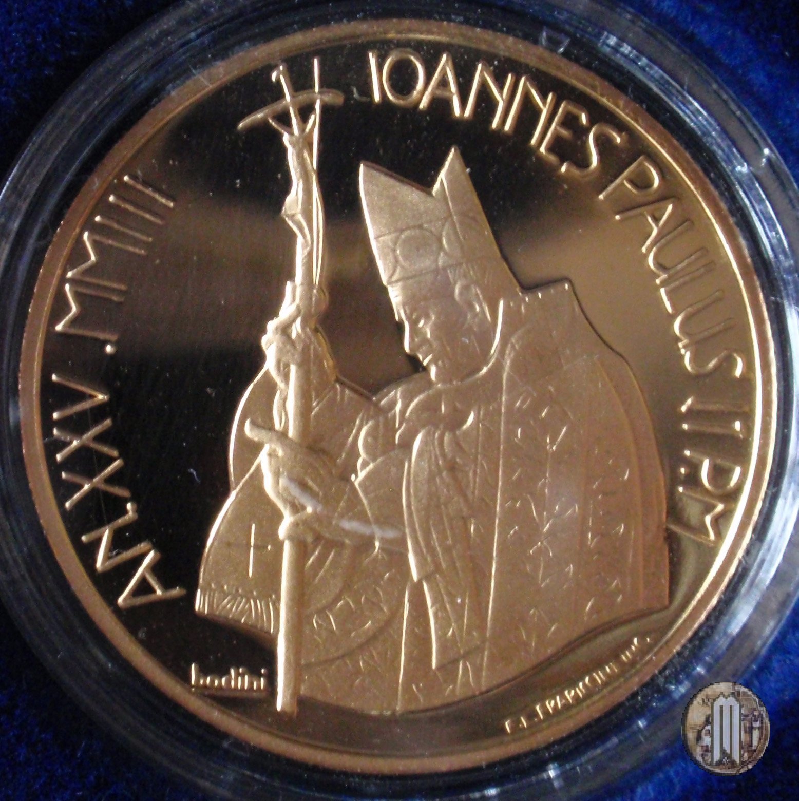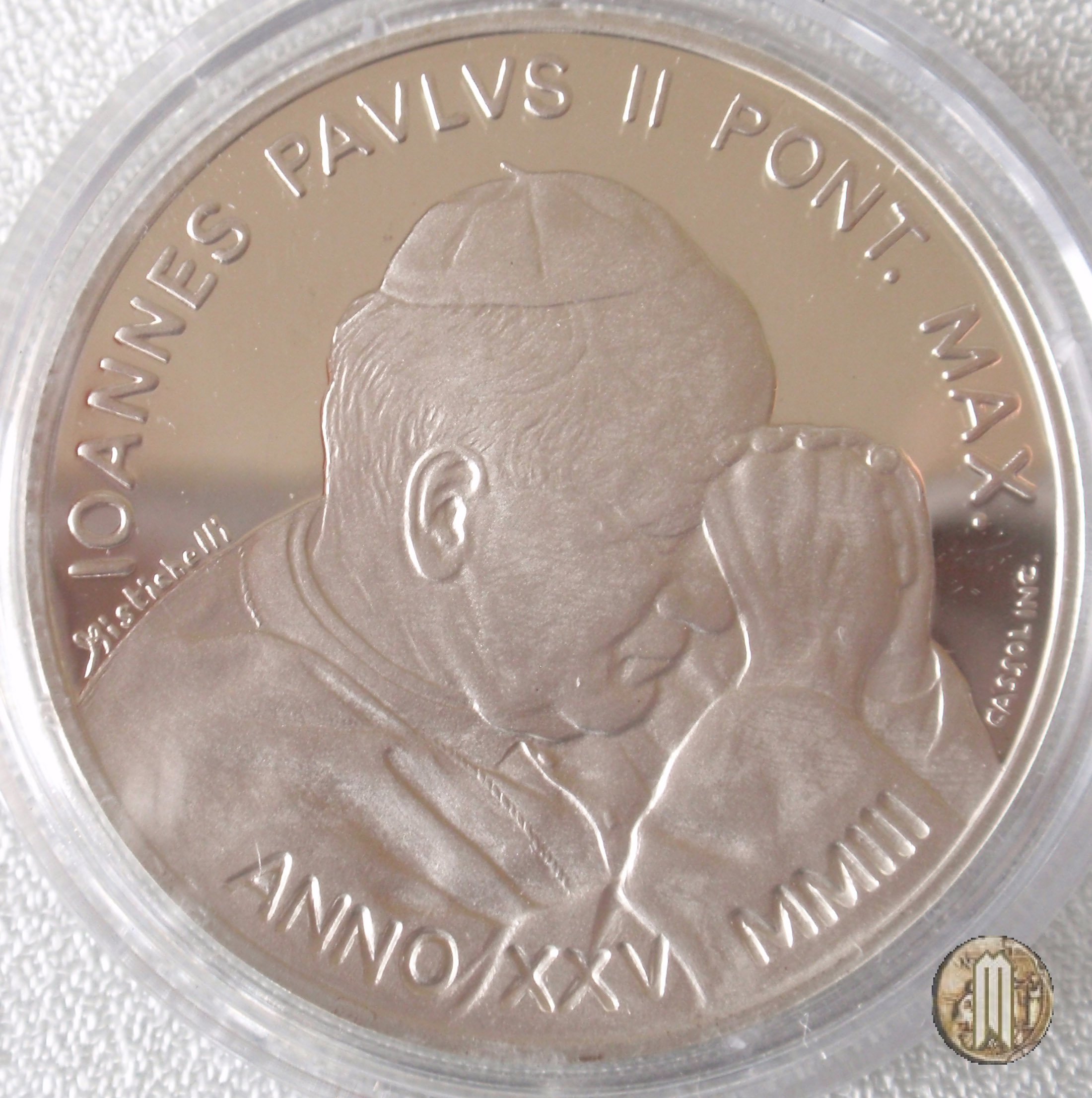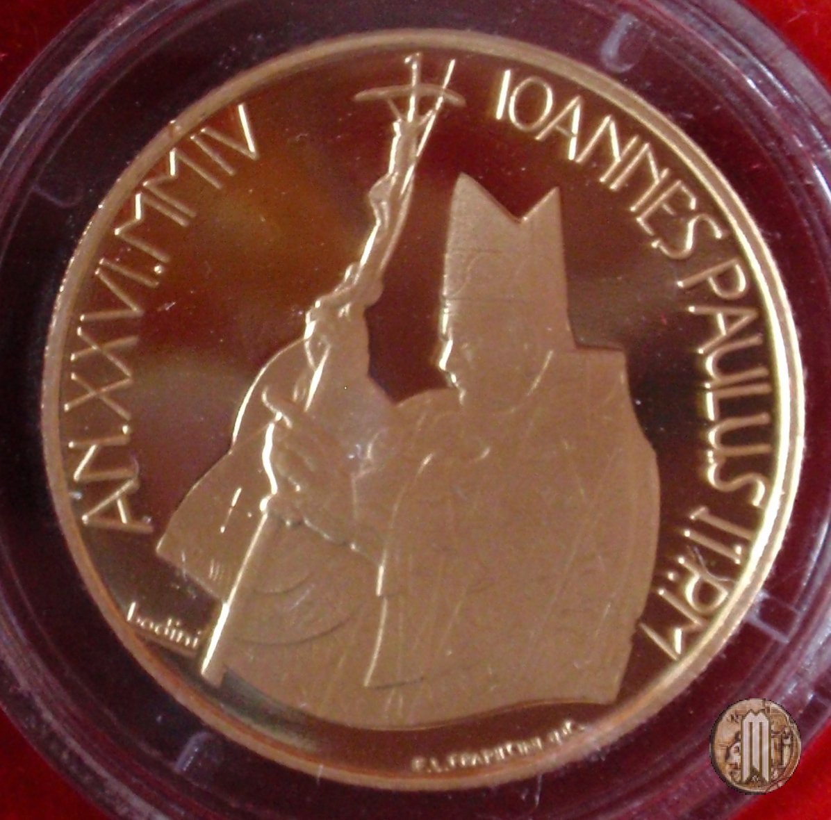 10 Euro 2003 XXV anno di Pontificato di Giovanni Paolo II Dritto: Immagine di Papa Giovanni Paolo II + Iscrizioni: IOANNES PAULUS II P.M.- ANNO XXV - MMIII Verso: Gesú consegna le chiavi a San Pietro +Iscrizioni: TU ES PETRUS ET SUPER HANC PETRAM AEDIFICABO ECCLESIAM MEAM ET TIBI DABO CLAVES REGNI CAELORUM - CITTA' DEL VATICANO - 10 EURO | |