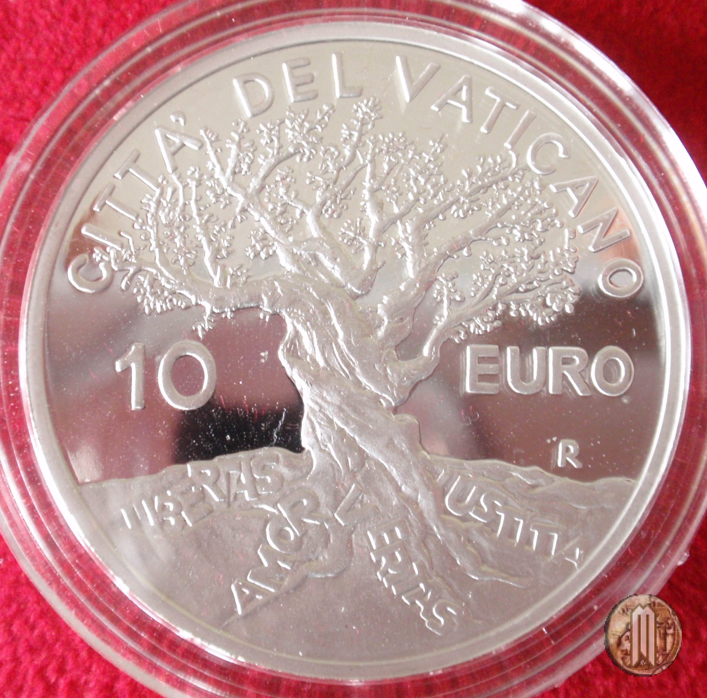 10 Euro 2010 43^ Giornata Mondiale della Pace Dritto: BENEDICTVS XVI PONT. MAX. A. VI MMX / volto del Santo Padre rivolto a sinistra. Verso: CITTA' DEL VATICANO - in esergo EU10RO / famiglia intenta a coltivare con amore la propria terra. | |