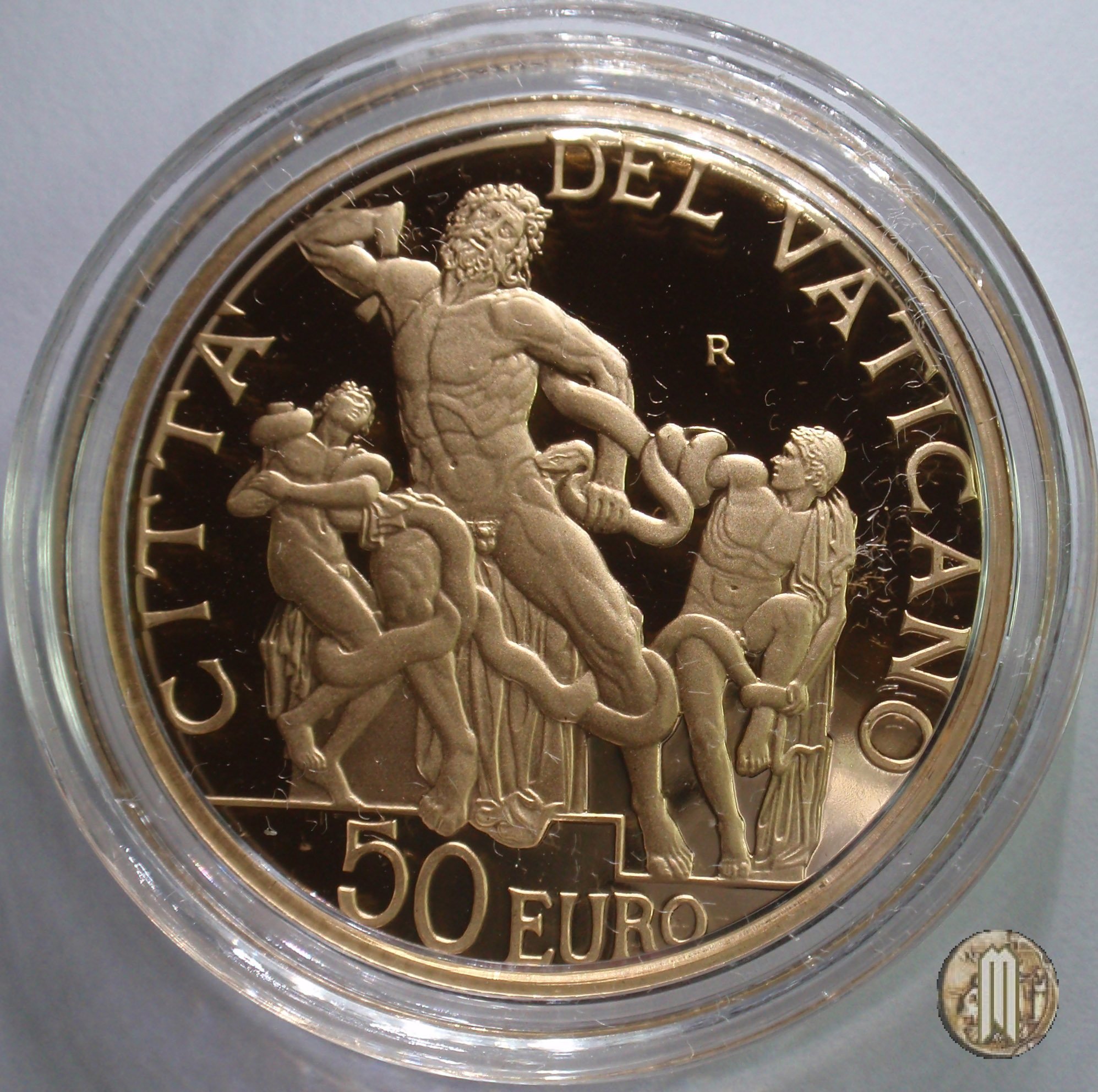 50 Euro 2009 Capolavori Scultura in Vaticano - Laocoonte Dritto: BENEDICTVS XVI P.M.A.V__MMIX Mezzo busto del Santo Padre rivolto a sinistra Verso: CITTA'__ DEL VATICANO 50 EURO Gruppo marmoreo del Laocoonte, con il sacerdote di Apollo e i suoi due figli, stretti tra le spire di serpenti marini che li uccideranno | |